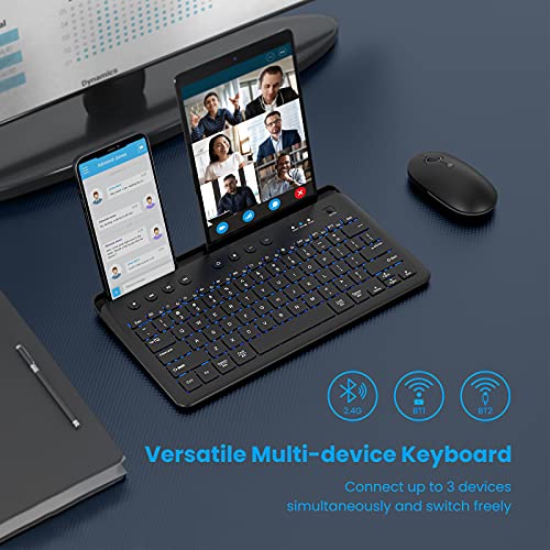 Multi-device Connectivity. Featuring 2.4G wireless mode and dual Bluetooth modes, Fatelegend wireless keyboard can be easily connected to 3 devices and switched freely. Enjoy lag-free and wireless working with a 10m range. Integrated holder holds your smartphone and tablet for better multitasking