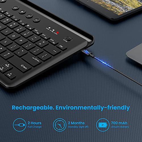 Rechargeable Convenience. Built-in 700mAh lithium battery, the wireless keyboard stay powered up to 2 months without light. Thanks to its auto-off sleep feature and an extra power switch, you can better manage battery power. Hassle-free to charge with an included Type-C charging cable