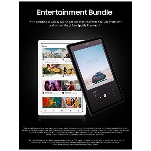 PREMIUM ENTERTAINMENT, ON US: With purchase of Galaxy Tab A7, get two months of free YouTube Premium and six months of free Spotify Premium. Battery Type and Size-7,040mAh